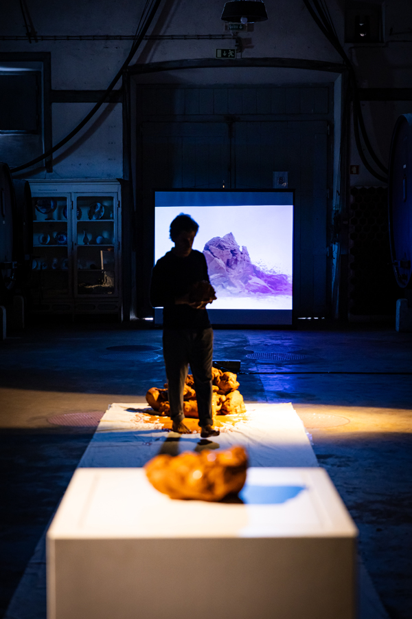 La performance est traversée par un dispositif audiovisuel.